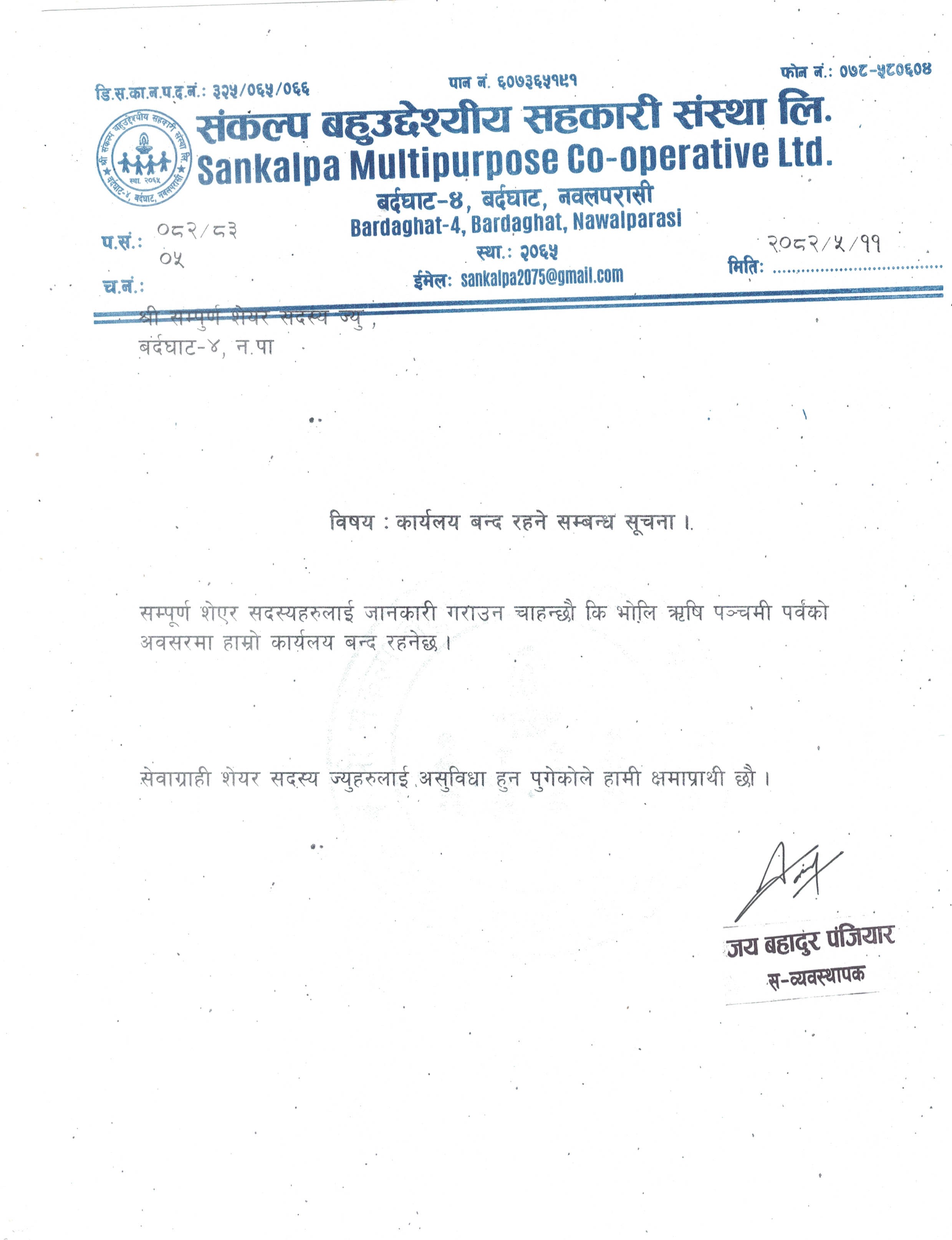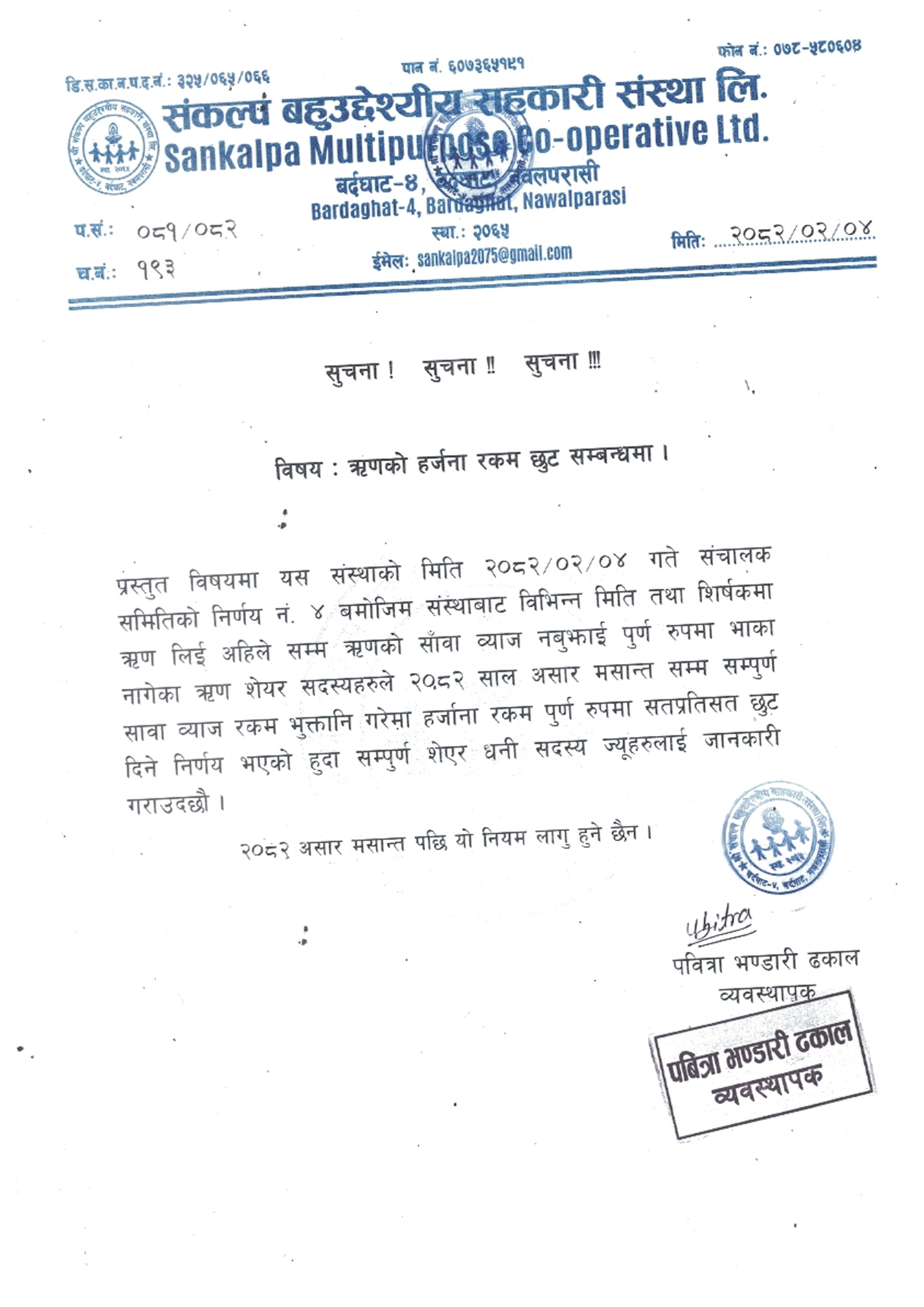 उपरोक्त सम्बन्धमा यस श्री संकल्प बहुउद्देश्यीय सहकारी संस्था लि.को मिति २०८१ भदौ ५...
