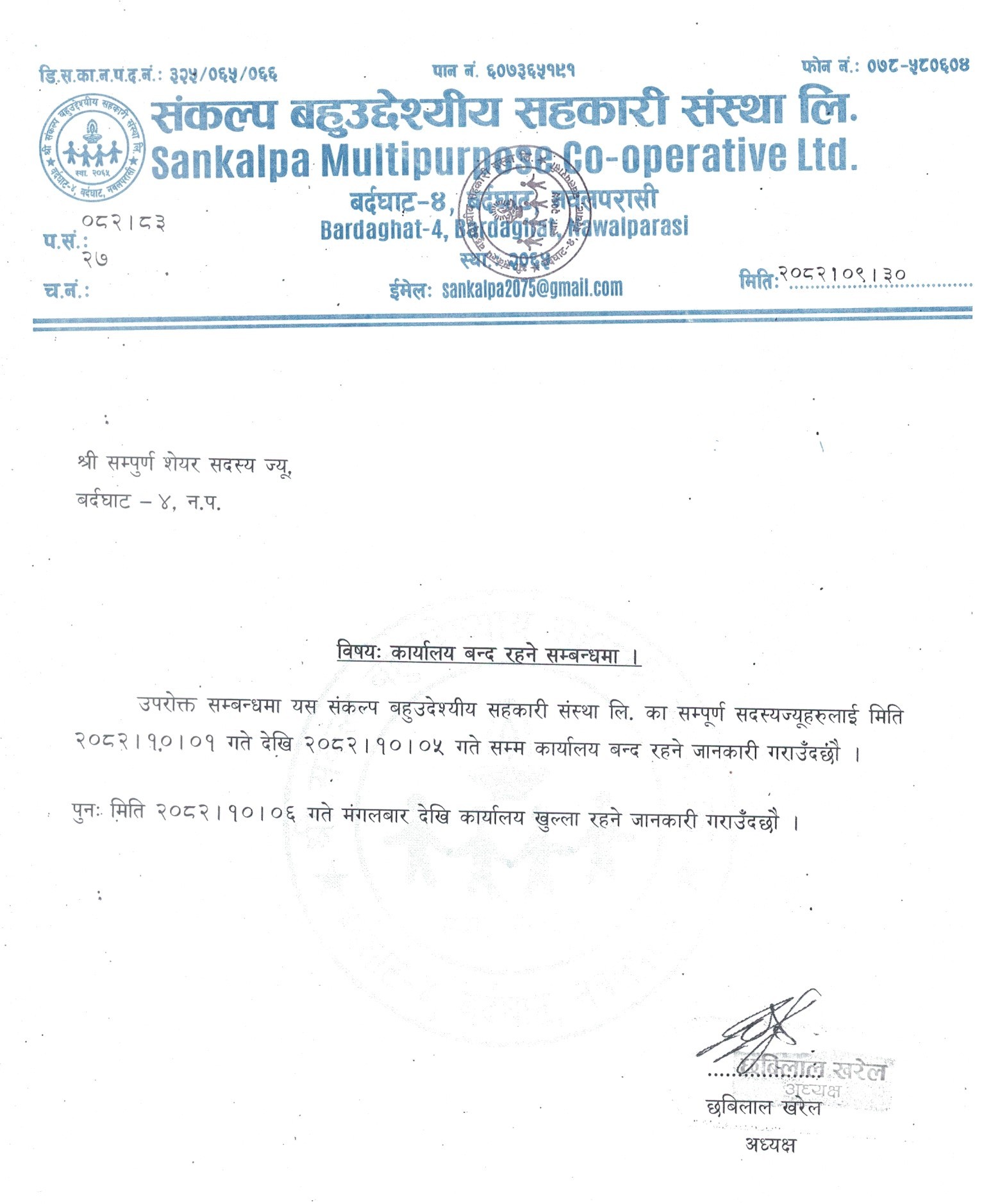 उपरोक्त सम्बन्धमा यस श्री संकल्प बहुउद्देश्यीय सहकारी संस्था लि.को मिति २०८१ भदौ ५...